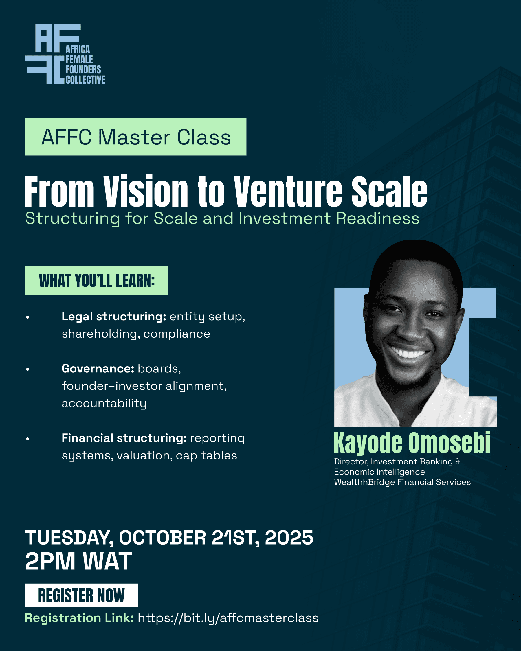 AFFC’s Masterclass Series is designed to close that gap, offering practical, founder-first guidance on how to structure ventures that scale and attract serious investment.